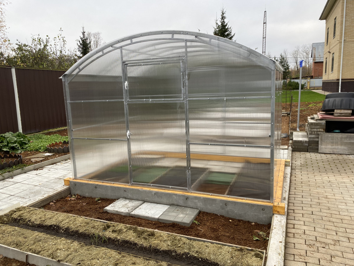 Возможна самостоятельная сборка по подробной инструкции. Сборка теплицы монтажниками-профессионалами компании занимает порядка 3 часов. В качестве основания рекомендуется использовать бетонный, либо деревянный фундамент из бруса. Предварительно брус необходимо обработать антисептиком. Полный комплект состоит из: